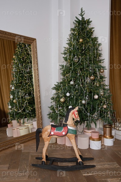 Интерьер комнаты, украшенной к Рождеству деревянной лошадью