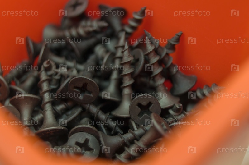 Черные винты в оранжевом ящике для инструментов. Россыпь металлических креплений. Крупный план коротких винтов. Выборочный фокус