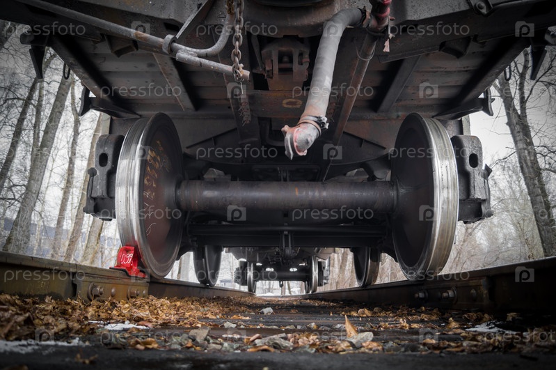 Колесные пары грузового железнодорожного вагона. Колесная тележка вагона поезда. Стальные колеса на рельсах железной дороги. Выборочный фокус