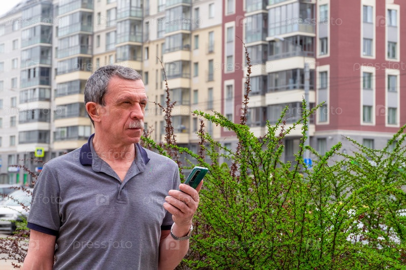 Взрослый кавказский пожилой мужчина в футболке стоит на фоне жилых домов
