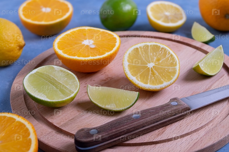 Кухонный нож и спелые цитрусовые целиком и нарезанные на круглой деревянной разделочной доске