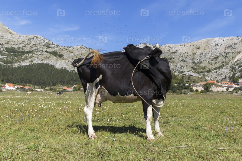 Черногория. котор. корова пасется на пастбище. черногория. котор. корова пасет в пастбище