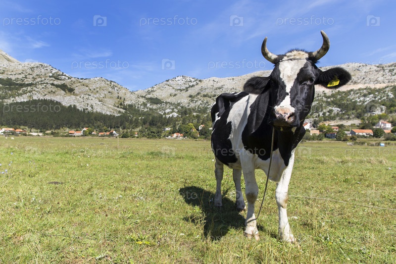 Черногория. котор. корова пасется на пастбище. черногория. котор. корова пасет в пастбище