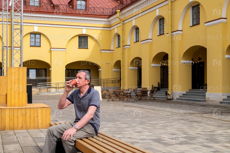 Взрослый пожилой мужчина сидит на скамейке и пьет кофе