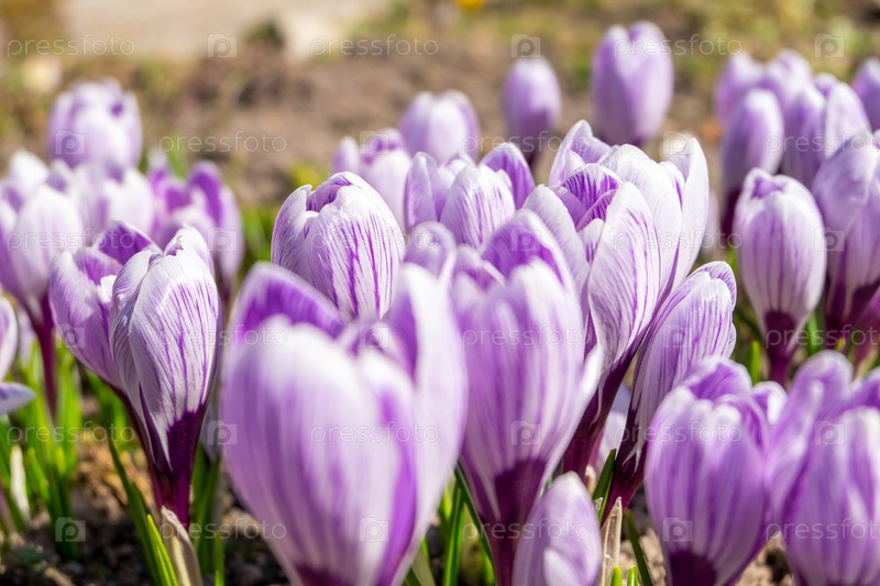 Первоцветы крокусы шафраны цветут на клумбе