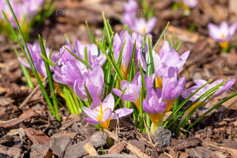 Весенние первоцветы, крокусы, шафран цветут на клумбе