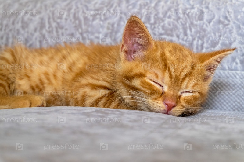 Маленький рыжий котенок устал и спит