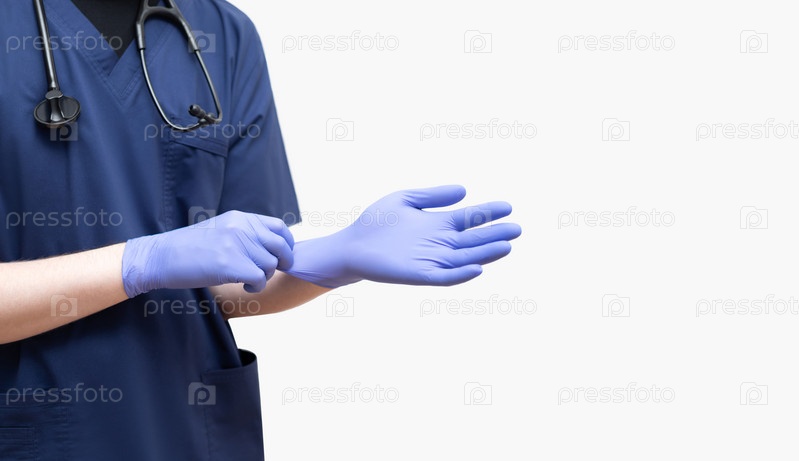 Врач в синей форме надевает стерильные перчатки на белом фоне. Баннер