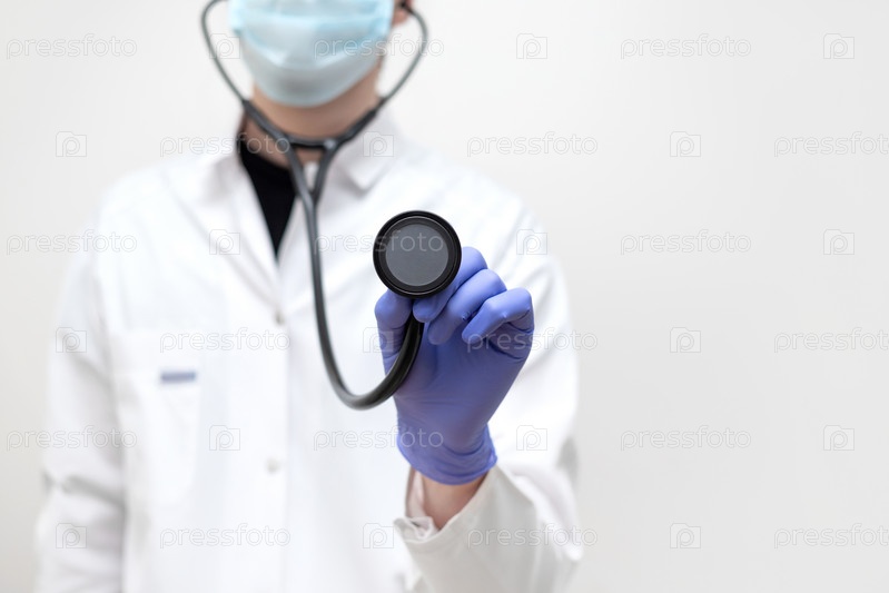 Врач в белой форме держит в руке стетоскоп на белом фоне. Кардиология