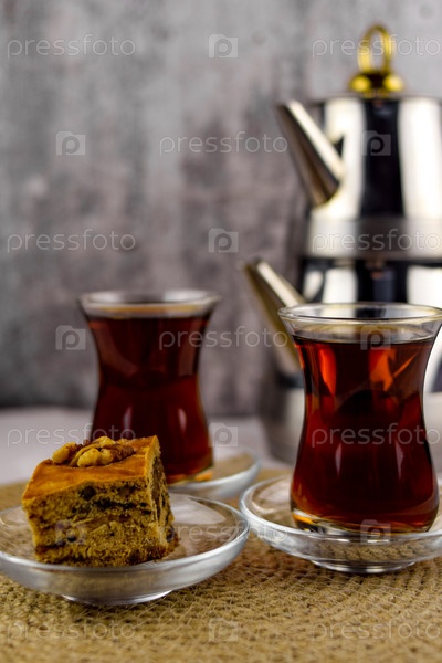 Турецкий чай, двухсоставной чайник, две кружки армуду на стеклянных блюдцах, рядом на блюдце кусочек пахлавы, на джутовой салфетке. Серый бетонный размытый фон