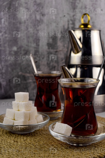 Турецкий чай, двухсоставной чайник, две кружки армуду на стеклянных блюдцах, на одном из блюдцев кусочек сахара, рядом на блюдце пирамидка из кусочков сахара, на джутовой салфетке. Серый бетонный размытый фон