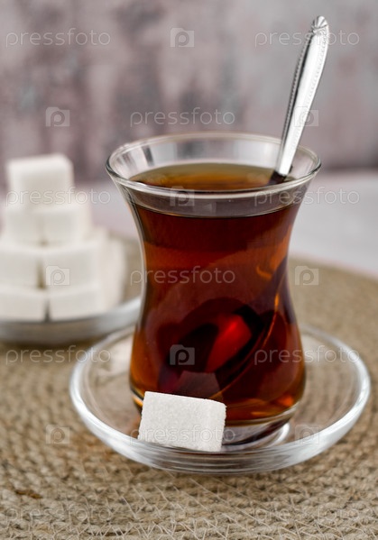 Турецкий чай, кружка армуду на стеклянном блюдца рядом кусочек сахара, в кружке чайная ложка, рядом на блюдце пирамидка из кусочков сахара, на джутовой салфетке. Серый бетонный размытый фон