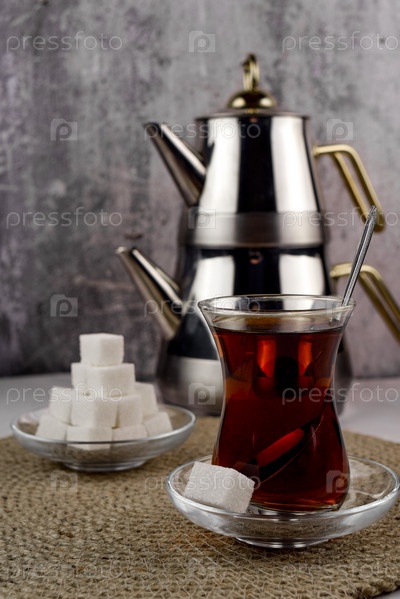 Турецкий чай, двухсоставной чайник, кружка армуду на стеклянном блюдца рядом кусочек сахара, рядом на блюдце пирамидка из кусочков сахара, на джутовой салфетке. Серый бетонный размытый фон