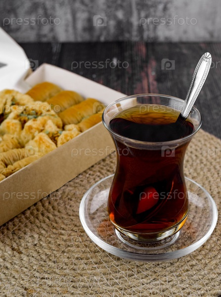 Турецкий чай, кружка армуду на стеклянном блюдце, в кружке чайная ложка, коробка с турецкими сладостями, на джутовой салфетке