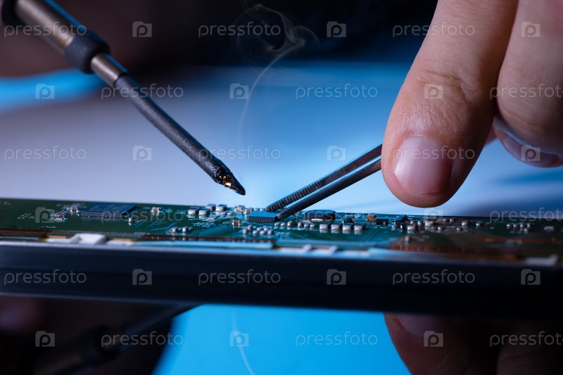 Горячий паяльник и пинцет в мужской руке. Ремонт электронного устройства
