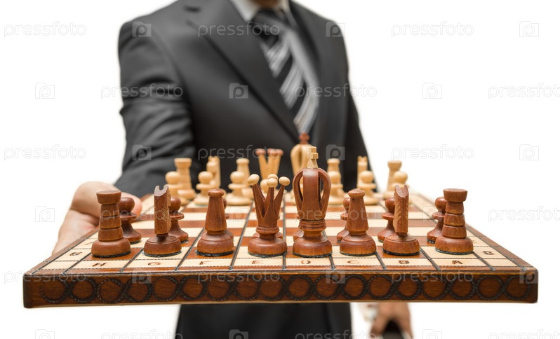 Шахматная доска с фигурами в мужской руке. Изолированные на белом фоне