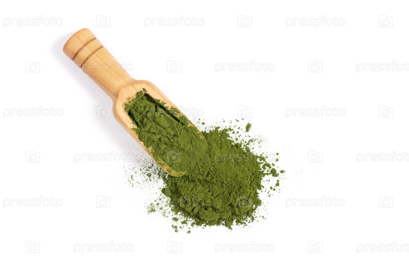 Зеленый порошок хлореллы в деревянной ложке, изолированной на белом фоне. Суперфуд. Спирулина или ячменный порошок. Вид сверху, плоская планировка