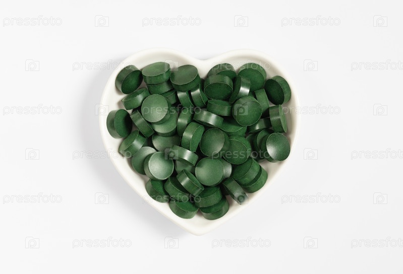 Зеленые таблетки спирулины в сердечной пластине, изолированные на белом фоне. Натуральная добавка из водорослей. Вид сверху, плоская планировка