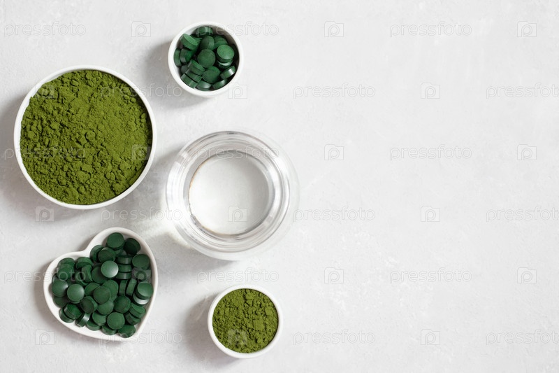 Зеленый порошок хлореллы, таблетки спирулины и стакан воды на белом фоне. Суперфуд. Веганские органические добавки. Скопируйте пространство, вид сверху