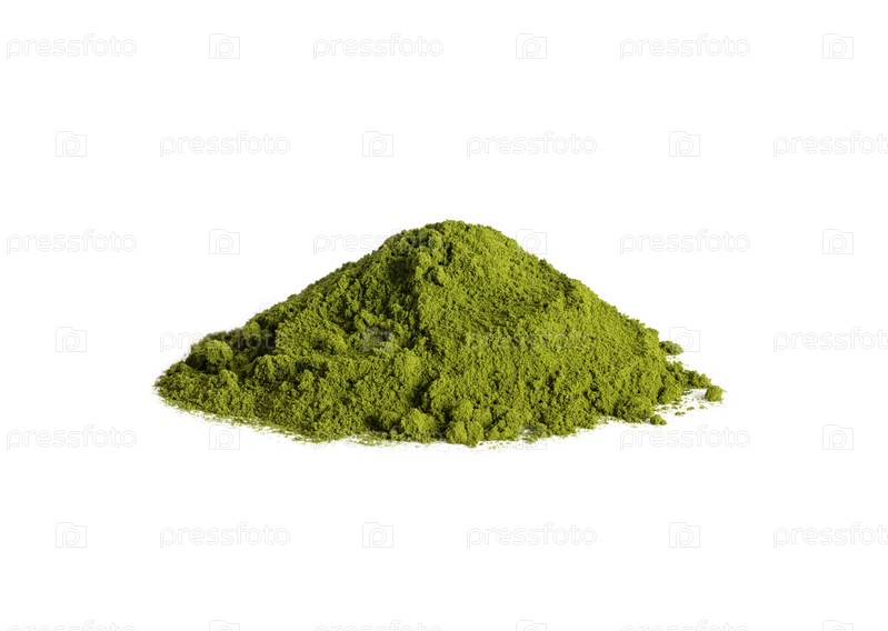 Куча порошка хлореллы изолирована на белом фоне. Водоросли спирулины или сухой порошок ячменя. Натуральная пищевая добавка