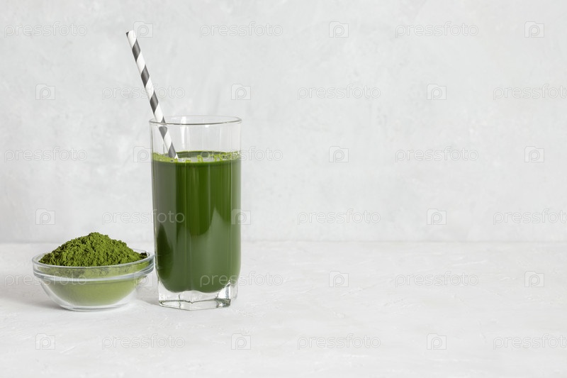 Зеленый напиток хлореллы в стакане и порошок в миске на белом бетонном фоне. Детокс-напиток и концепция суперпродуктов. Натуральная добавка с водорослями. Скопируйте пространство