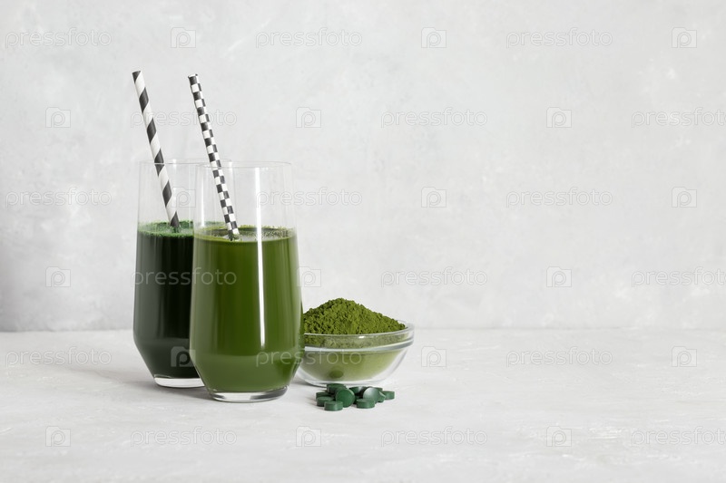 Зеленый детокс-напиток с хлореллой и спирулиной. Порошок хлореллы и таблетки спирулины, стаканы с зелеными напитками на сером фоне. Концепция суперпродуктов. Место для текста
