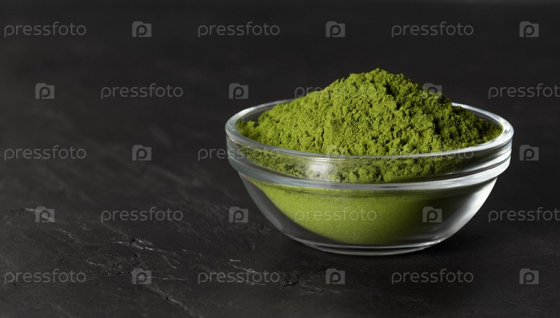 Зеленый порошок хлореллы в миске на каменном черном фоне. Порошок спирулины или ячменный порошок. Суперфуд. Копировать пространство