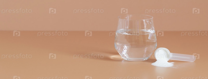 Коллагеновый порошок в мерной ложке и вода на бежевом фоне. Баннер. Добавка для красоты кожи и здоровья костей. Копировать пространство