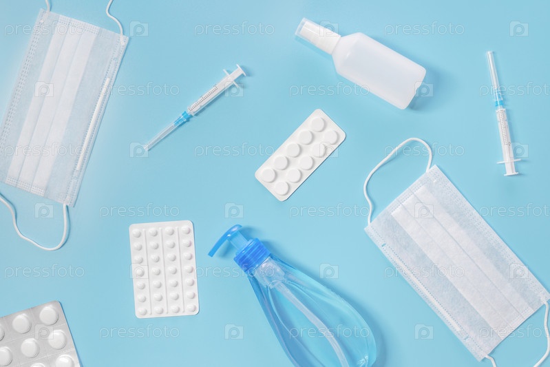 Медицинская аптечка. Средства для профилактики и лечения гриппа или коронавируса. Маска, дезинфицирующее средство и лекарства на синем фоне