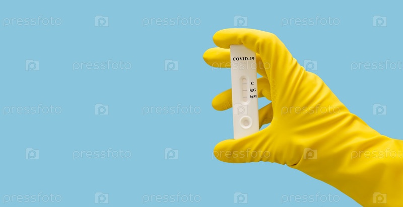 Экспресс-тест covid-19 в руке в желтой защитной перчатке на синем фоне.Неиспользованный тест на коронавирус