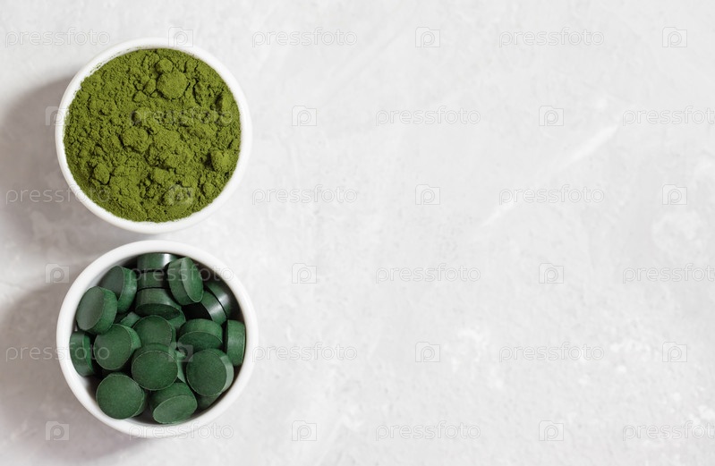 Хлорелла и спирулина в мисках на белом бетонном фоне. Таблетки и порошковая форма. Детокс суперфуд. Здоровая добавка. Вид сверху. Скопируйте пространство