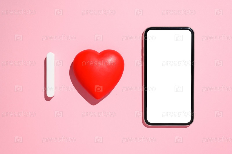 Красное сердце и смартфон с белым пустым дисплеем на розовом фоне. Абстрактная надпись, которую я люблю. Концепция поздравления с 14 февраля