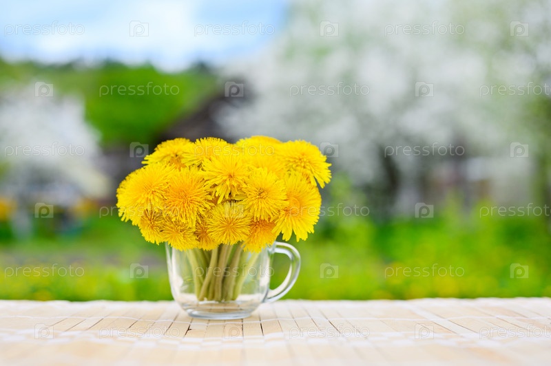 Букет желтых цветов стоит на столе на фоне зеленого сада