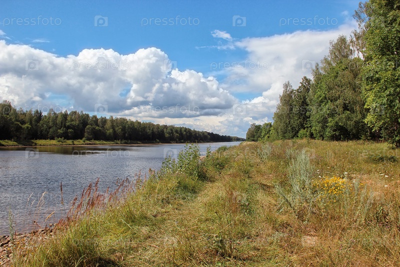 Красивый пейзаж с видом на реку. Солнечная погода с голубым небом и белыми текстурными блоками. Потрясающие пейзажи. Теплый летний день у реки