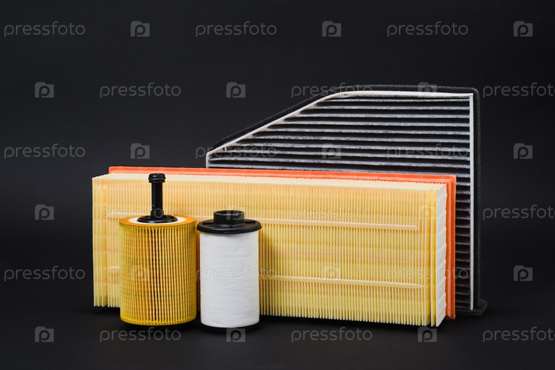 Набор фильтров для автосервиса. Автозапчасти на черном фоне