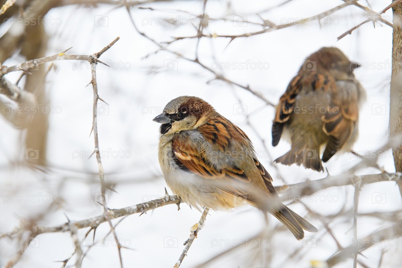 Воробьи на ветвях кустов в сильный мороз. Фокусировка на ближайшем воробье