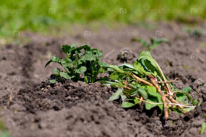 Молодой росток картофеля на фоне выщипанных сорняков и травы