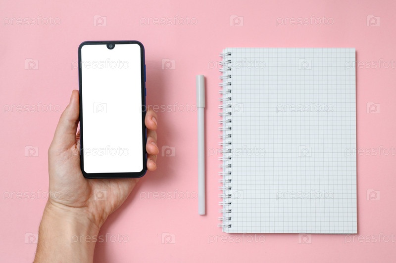 Мужская рука держит смартфон с белым дисплеем. Рядом с рукой лежит блокнот с чистой страницей и ручкой для письма. Розовый фон