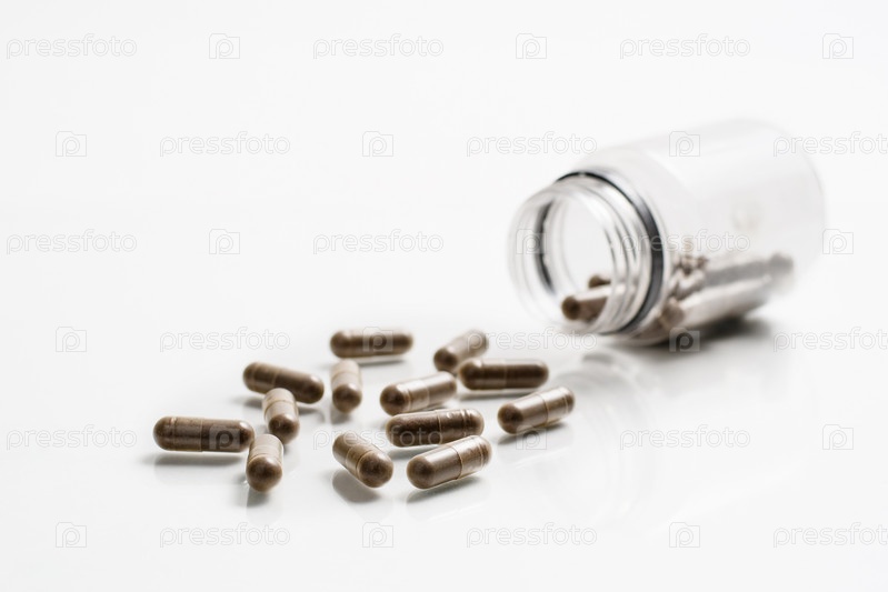 Темные капсулы на белом фоне. Гомеопатические препараты и витамины. Концепция альтернативной медицины с гомеопатическими и растительными лекарствами. Выборочная фокусировка на переднем плане