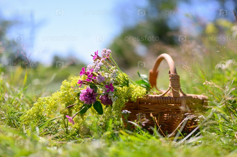 Плетеная корзина стоит на природе с полевыми цветами