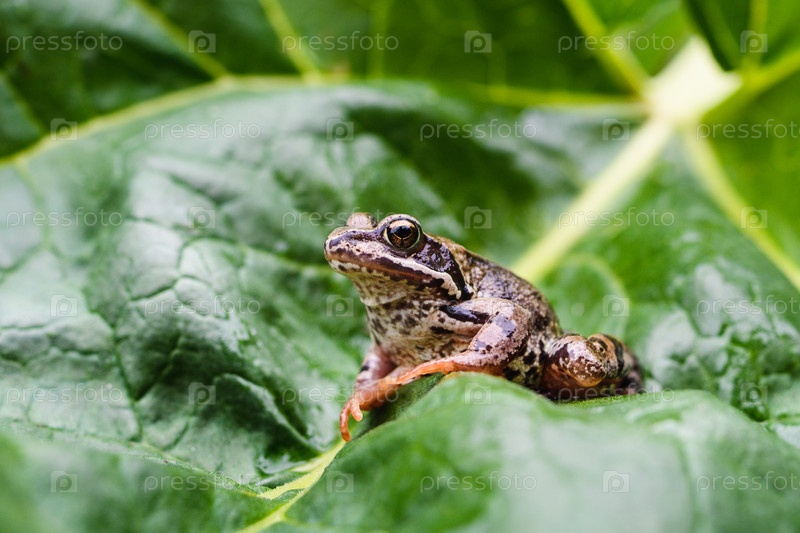 Лягушка сидит на огромном зеленом листе растения