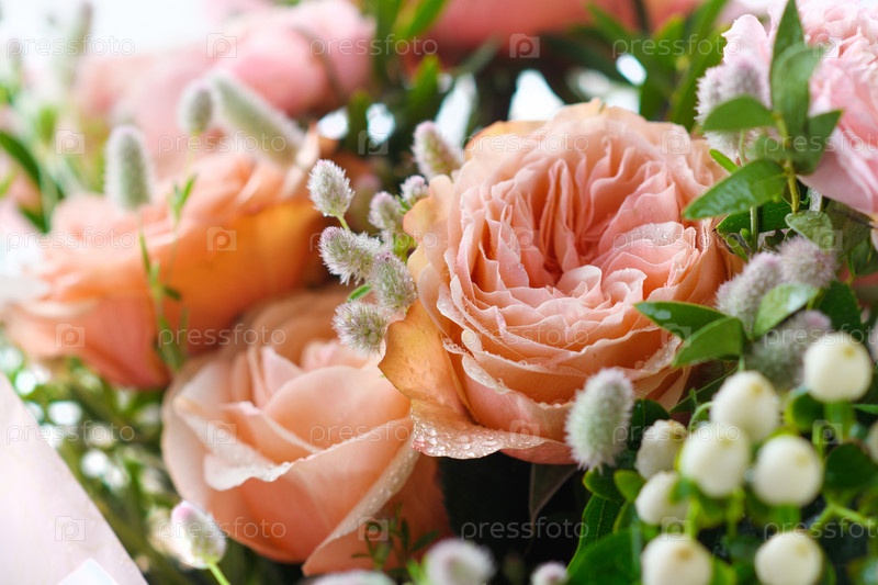 Букет кустовых роз с белыми ягодами. Капли воды на лепестках роз