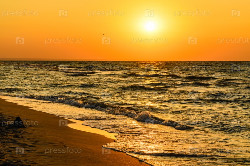 Романтический вечерний морской пейзаж. Прекрасный закат. Выборочная фокусировка на переднем плане и у кромки воды