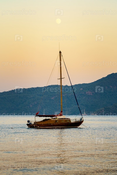 Маленький парусник стоит в море под луной