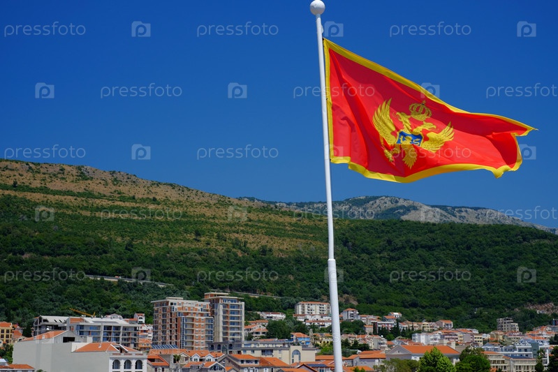 Флаг Черногории развивается на ветру на фоне курортного города Петровац