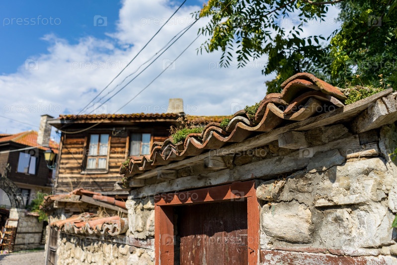 Старая черепичная крыша в старом городе Болгарии. Старое здание в городе Несебр. Селективный фокус на старых плитках