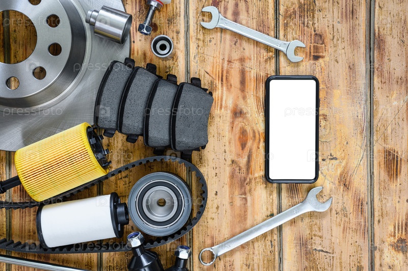 Смартфон с белым дисплеем и автозапчастями на деревянном фоне. Бланк для рекламы магазина автозапчастей