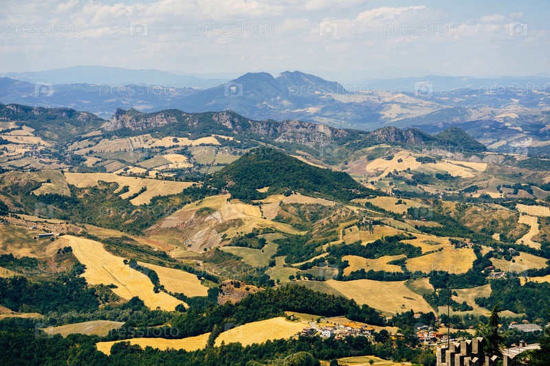 Горы с зелеными растениями на фоне голубого неба. Желтые поля у подножия гор в Сан-Марино
