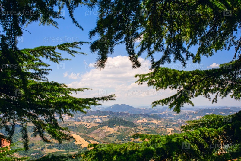 Вид на горы Сан-Марино сквозь зеленые сосновые ветки