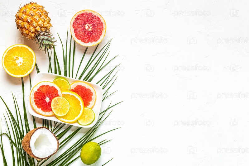 Тропические фрукты и пальмовые листья на белом фоне